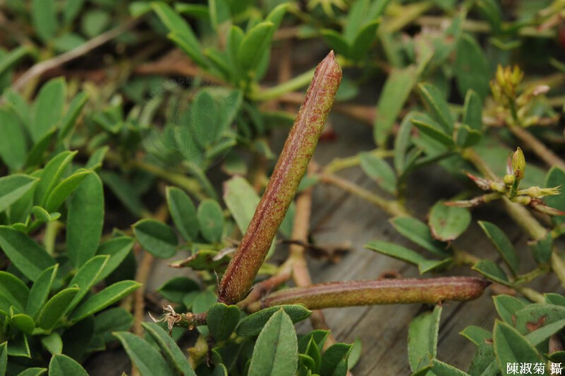 一年生至二年生草本,被二叉伏毛。羽狀複葉;小葉4-6,互生,橢圓倒披針形,長8-18 mm,寬2.5-5 mm,上面近緣處被毛,背面被毛,先端微凸。花紅色。莢果具四稜角,線形,長21-23 mm,種子7-10粒。 (劉和義、楊遠波、呂勝由、施炳霖 1998)