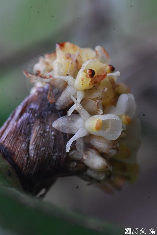 屬特徵- 附生,具匍匐根莖。莖扁平;節間多,完全由葉鞘包住。葉二列,狹長。頭狀花序,由多數苞片包住。萼片與花瓣相似;唇瓣基部囊狀;蕊柱短,幾無足;花粉塊8,臘質,具短柄。 種特徵- 莖叢生,扁形,包被著重疊的葉鞘。葉帶狀。花序成頭狀,直徑約1.5-2.5 cm,由眾多小花組合而成,每一花枝長約1.4cm,著生2-3朵花。花甚小,寬6.5 mm,白色後轉黃色。 (林讚標 2001)