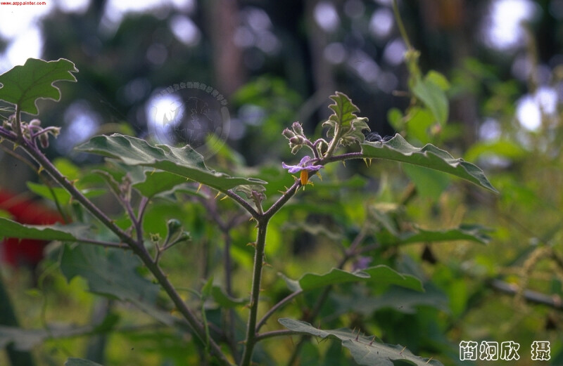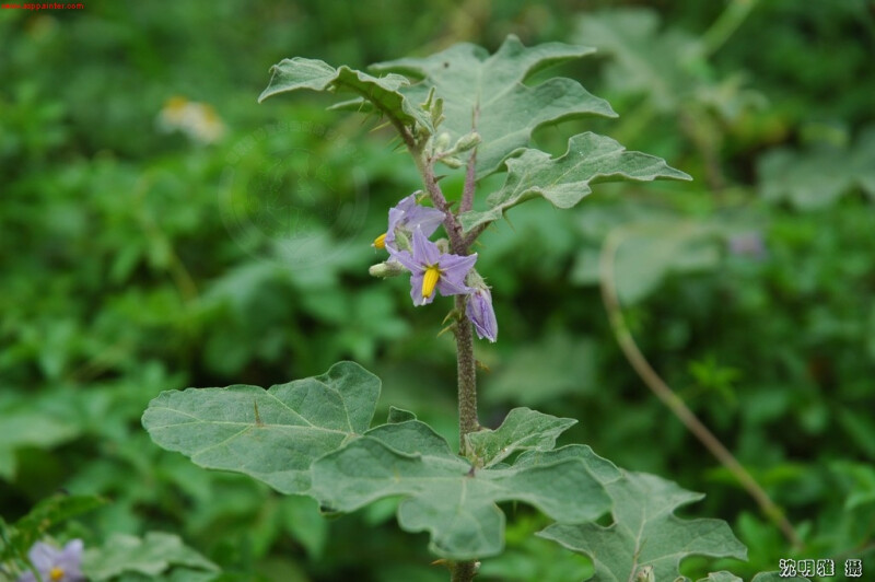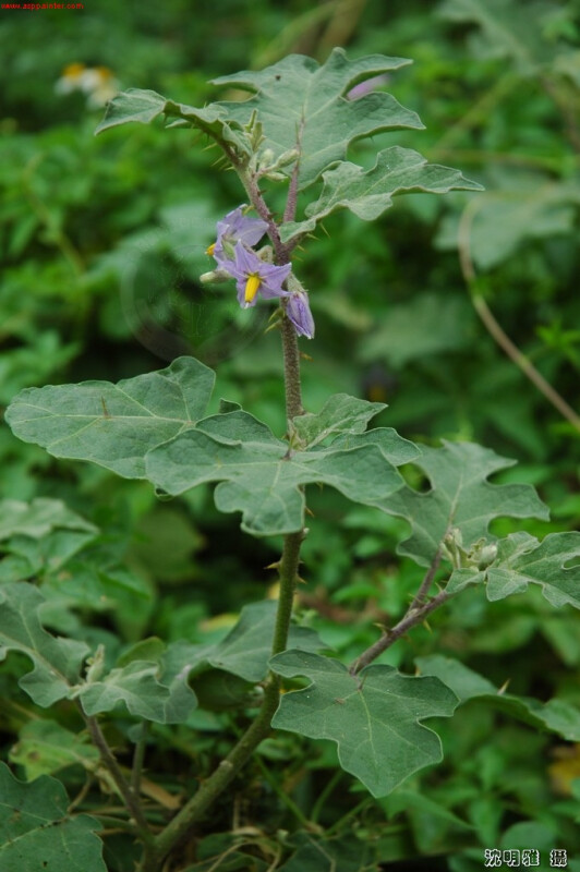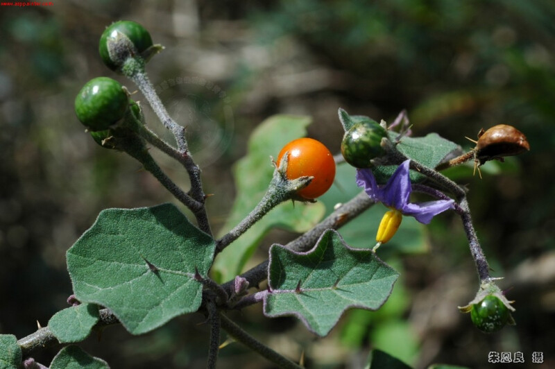 有刺灌木,被星狀毛;刺黃色,彎曲。葉一大一小同節,卵形,長5-11 cm,寬2-8 cm,5-7波狀淺裂,表面被曲柔毛,背面被毛及皮刺。蝎卵狀總狀花序節間著生;萼片被毛及皮刺;花瓣藍紫色或白色,長1-2 cm。果亮橘色,徑寬8-13 mm。 (楊遠波、劉和義、施炳霖、呂勝由 1999)