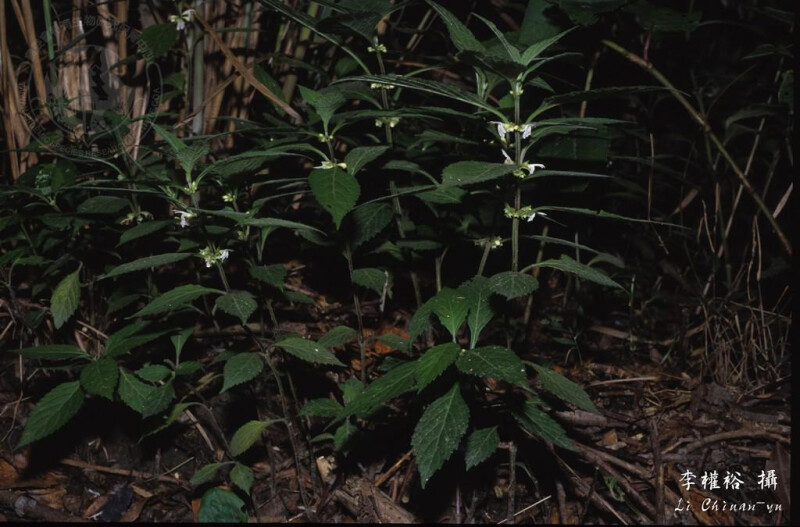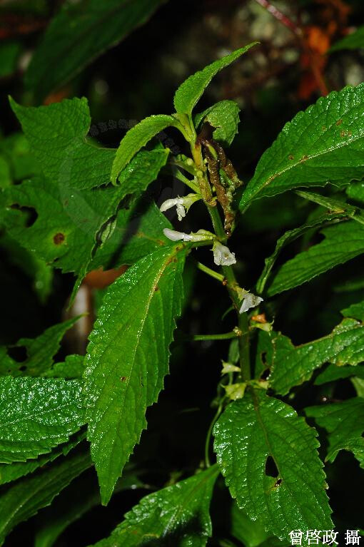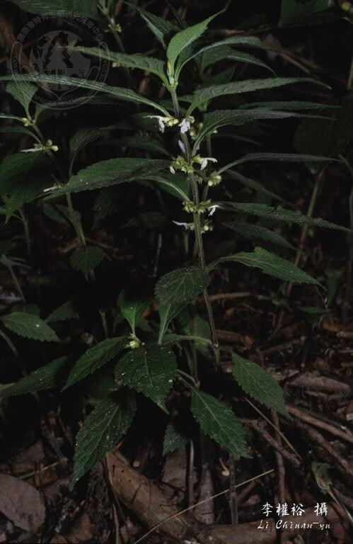 多年生草本;葉片橢圓形至卵形,長5-18 cm,寬2-5 cm,基部漸狹或長楔形帶翼下延,先端漸尖,明顯鋸齒緣,表面疏被微毛,背面被腺點;葉柄長1-4 cm。 (楊遠波、劉和義、施炳霖、呂勝由 1999)