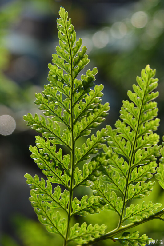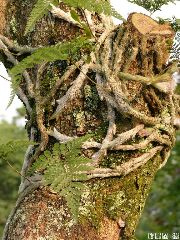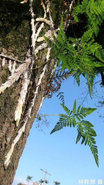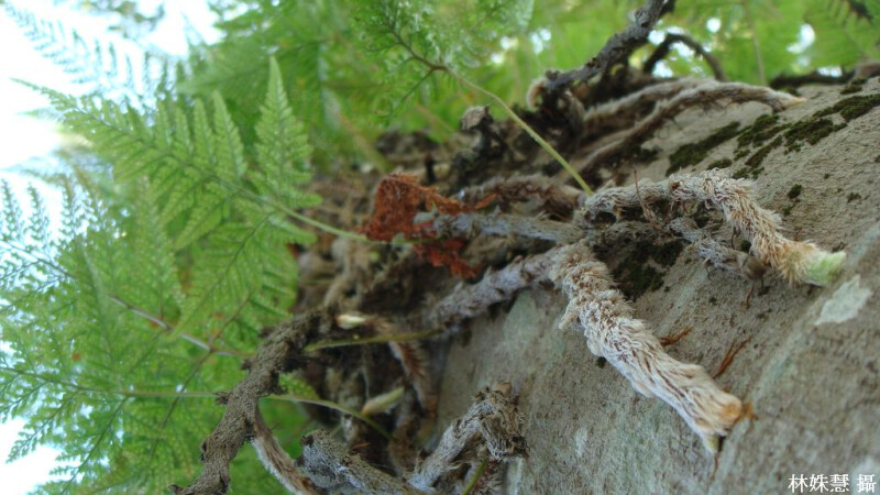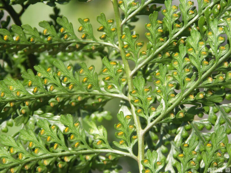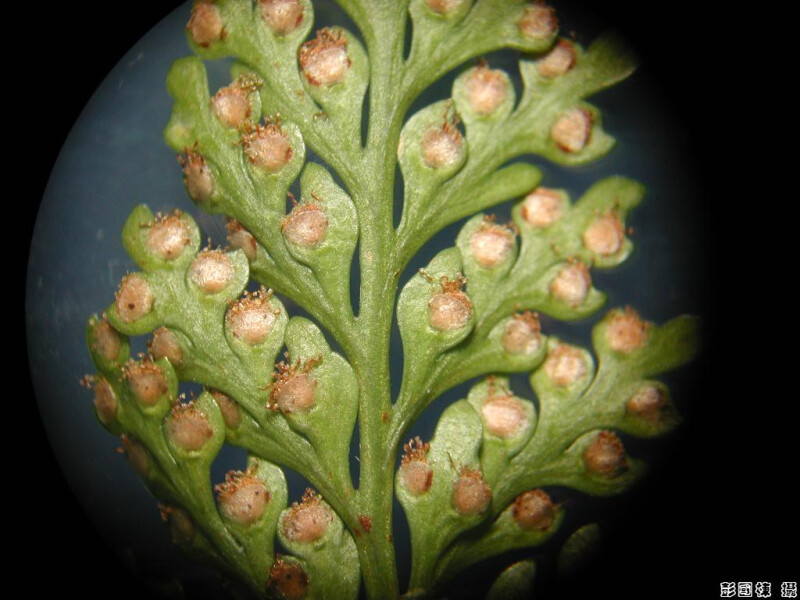 根莖大約1cm粗,密佈褐色鱗片,周緣略白。葉五角形,基部羽片之下小羽片長,基部四回羽狀複葉,孢子囊在葉緣偏內側,孢膜短杯狀。 (郭城孟 1997)