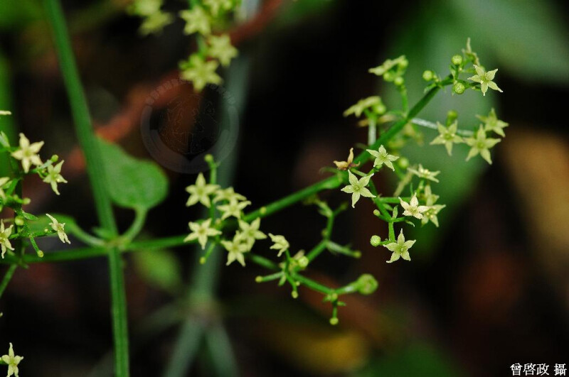 蔓性草本;莖近圓形,疏被倒刺或平滑無刺。葉4枚輪生,倒卵形、長橢圓形或長橢圓披針形,長2-8 cm,紙質,3主脈,葉基心形或截平,表面平滑無刺,葉柄具倒刺。 (楊遠波、劉和義、施炳霖、呂勝由 1999)