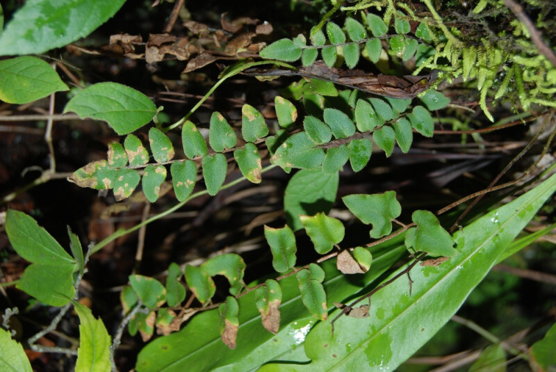 屬特徵-  莖短走或直立,具有細鱗,柄紅褐色,具有毛和鱗片,羽狀複葉,游離脈,孢子囊沿脈生長。 種特徵-  叢生,根莖具黃色細鱗。一回羽狀複葉,頂羽片和側羽片同型,羽片基部心形,末端略尖。葉密佈銹色柔毛,孢子囊陷在絨毛之中,沿脈生長。 (郭城孟 1997)