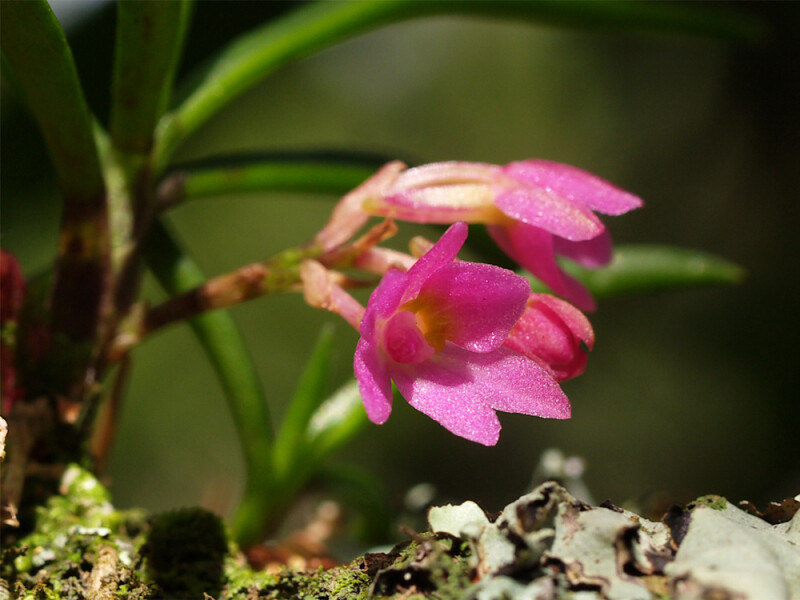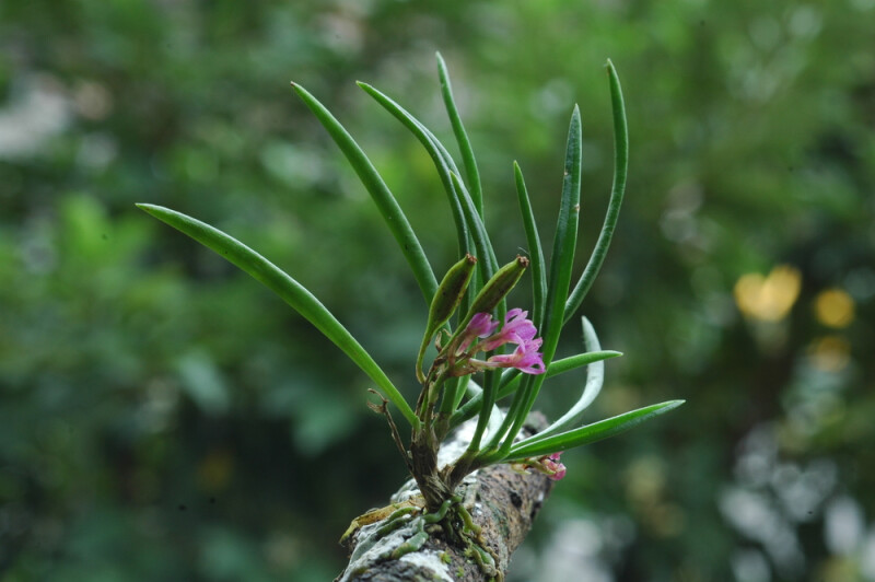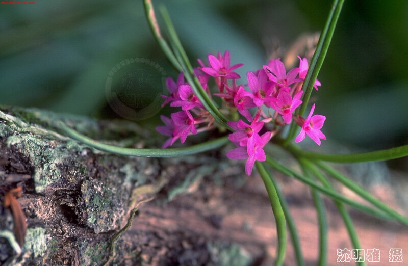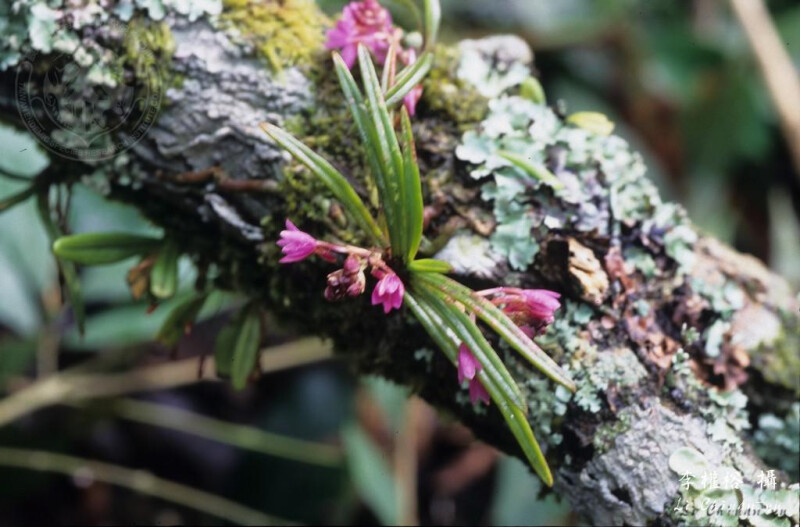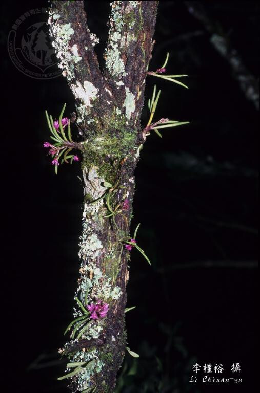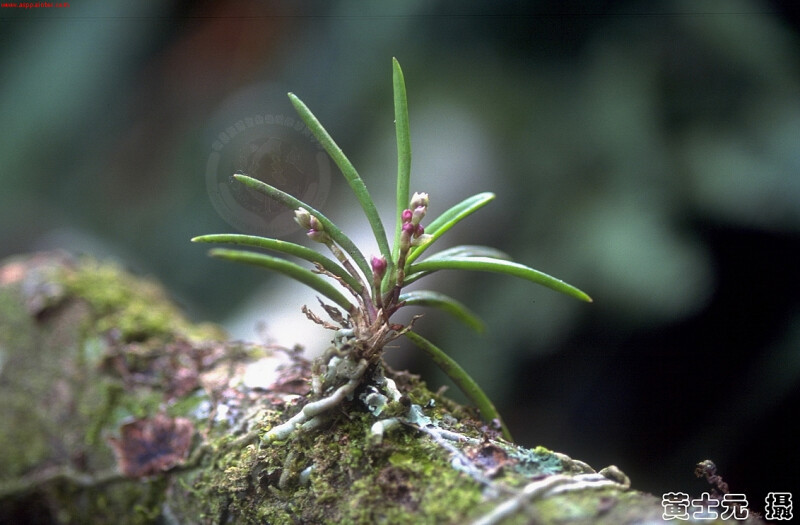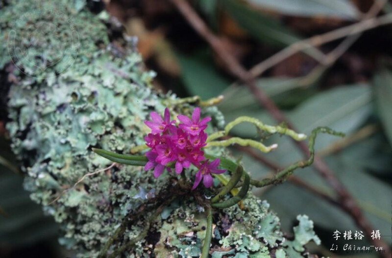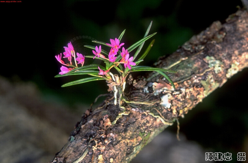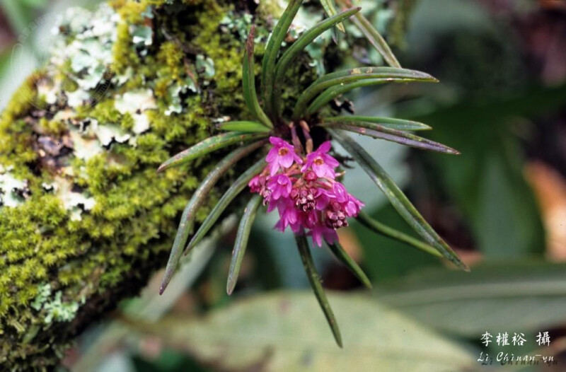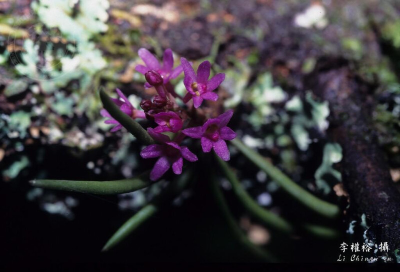 屬特徵- 附生。莖與節間均短。葉二列,狹,近圓形。腋生總狀花序,具多朵花。萼片與花瓣相似,均離生;唇瓣3裂,具距,中裂片較大,舌狀;蕊柱短,無足;花粉塊2,臘質,具柄與粘盤;喙2裂。 種特徵- 小型附生蘭。植物體矮於6 cm。葉二列互生,針狀,略彎曲,上表面中央有一縱溝,厚革質。花莖腋生;總狀花序具3-10朵花。花紫紅色。果長橢圓形。 (林讚標 2001)