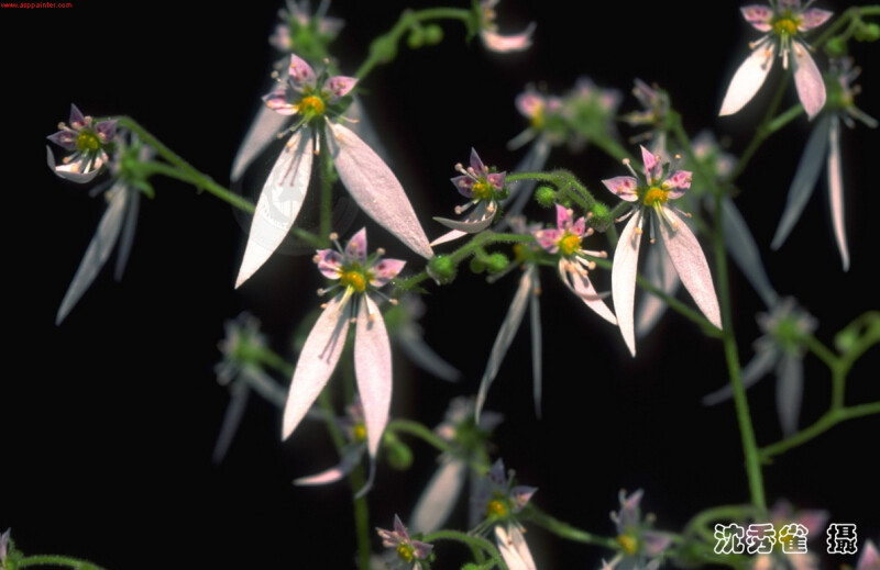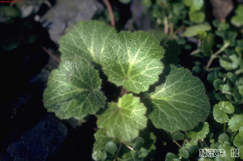 屬特徵- 草本,多年生,偶一或二年生;莖匍匐。單葉,基生及莖生,常為齒緣或具裂片。花序總狀或圓錐狀,稀單生。花兩性,白至粉紅,紫或黃色;萼5裂;花瓣5;雄蕊10,2輪;心皮2,基部合生,花柱2。蒴果2室,自花柱間開裂。 種特徵- 具走莖草本,全株密被毛。葉肉質,具長柄,圓腎形,長3-5 cm,寬3-9 cm,沿脈有蒼白色條斑。花莖長10-20 cm。花排成圓錐狀,白色;花瓣較小3片為淡紅帶有深紅斑點,較大2片為純白色。果卵球狀,長4-5 mm。 (劉和義、楊遠波、呂勝由、施炳霖 1998)