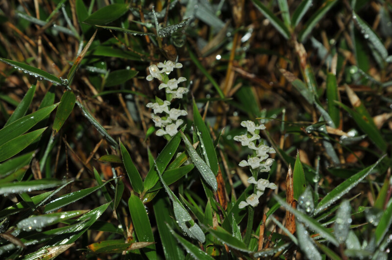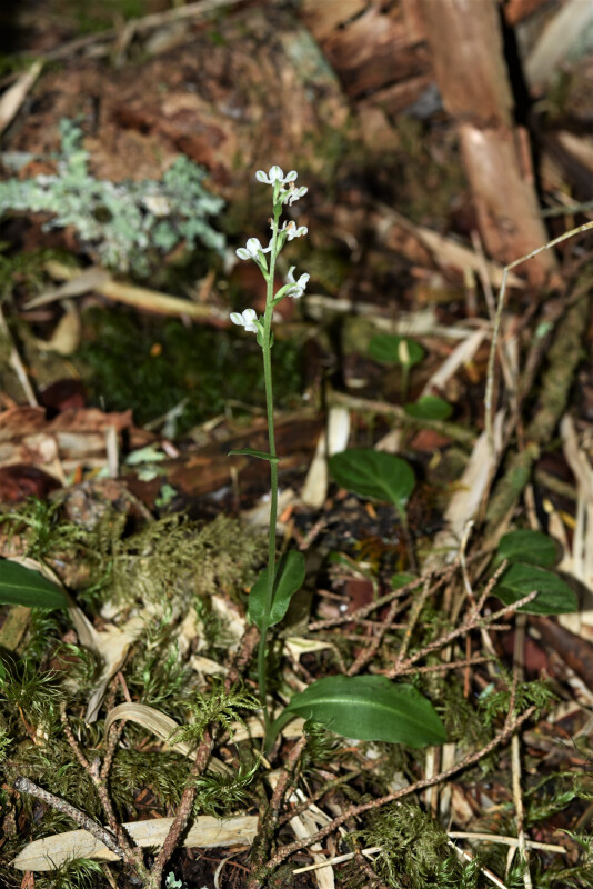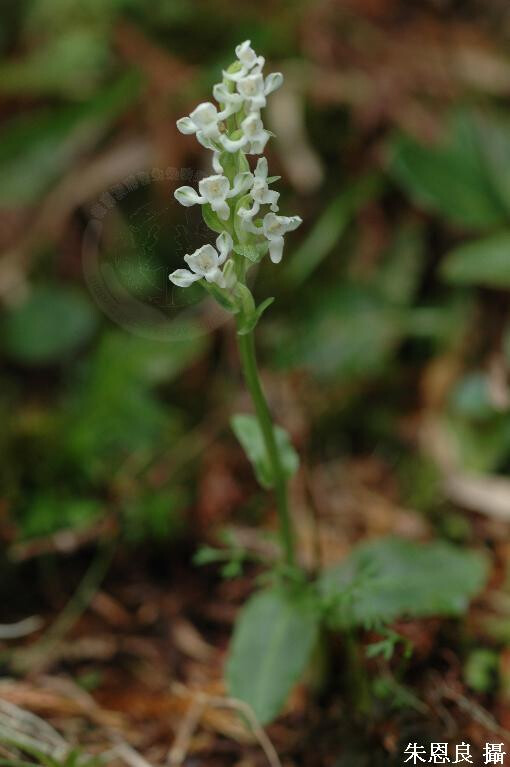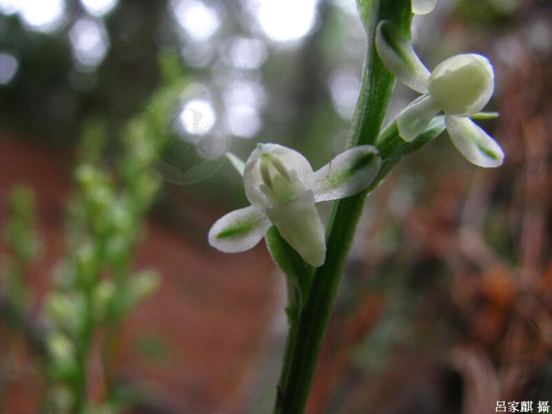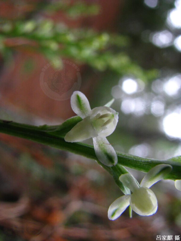 根莖鑲嵌體呈走莖狀,在離開莖基一段距離後,自其先端附近生長出新的芽眼。葉1或2片,長橢圓至橢圓形,銳頭。花序具許多花。花白色,寬約1 cm。 (林讚標 2001)