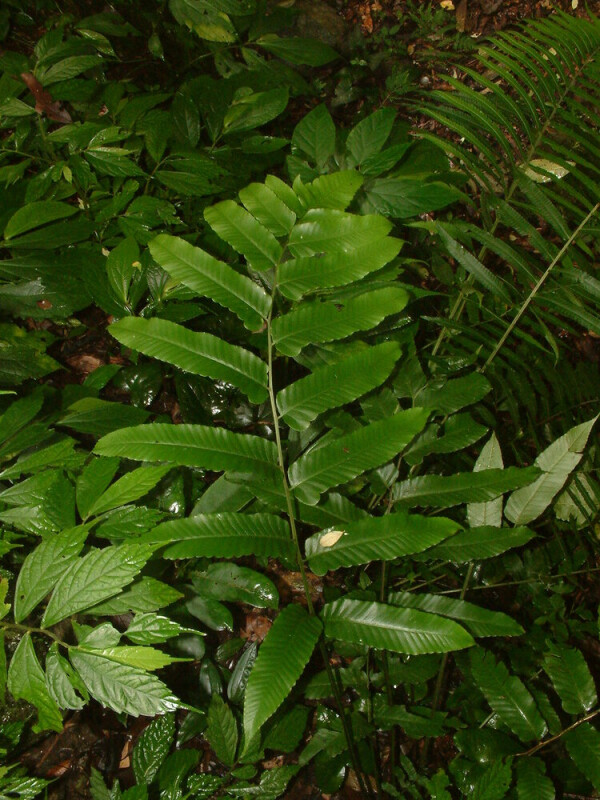 葉為一回羽狀複葉,羽片邊緣至多由葉緣與羽軸間的 1/2 處,羽片基部不具三角狀突起,羽片寬約 4 公分。 (郭城孟 1997)