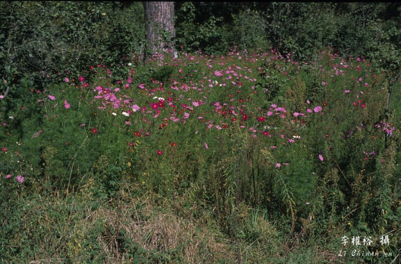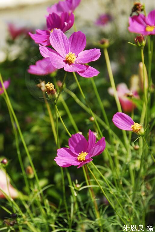 一年生草本,植株高0.6-2 m,無毛或於莖節處被毛,或具短剛毛於莖上排列為線狀。葉對生,長6-11 cm,二或三回羽裂,裂片線形。頭花直徑3-8 cm,具5-20 cm長的總梗。舌狀花8朵,白、粉紅、桃紅或暗紅色。 (彭鏡毅、鍾國芳 1999)