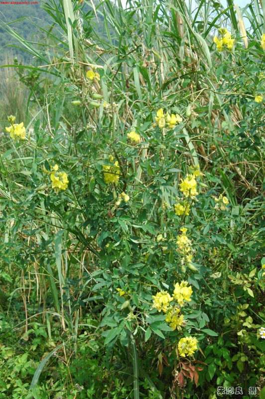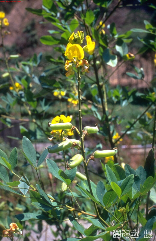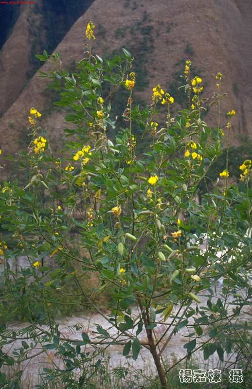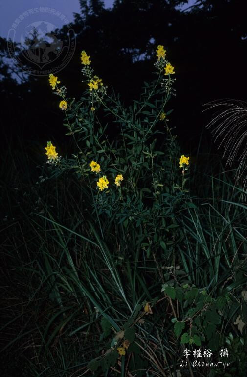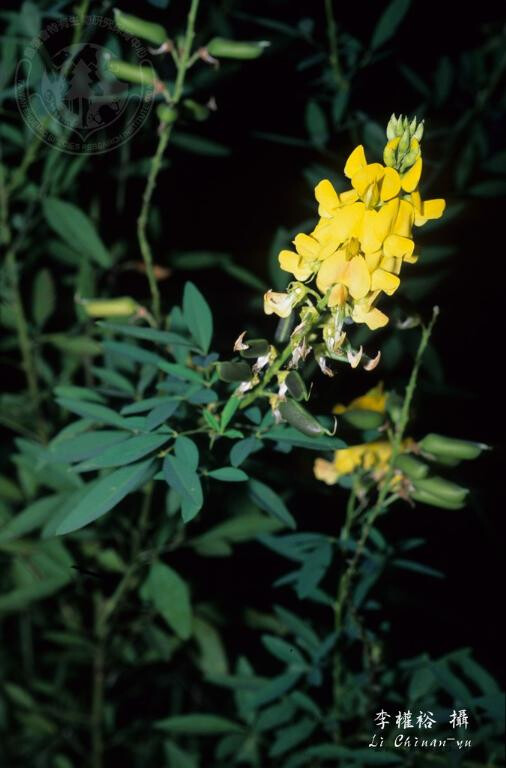 半灌木,被毛。三出葉,頂小葉長橢圓形,長4-6 cm,寬1.5-2.5 cm,先端漸尖。萼片5中裂,最底之萼片遠長於其餘4片。花瓣黃色。莢果長橢圓筒狀,被毛,長約2.5-3.5 cm。 (劉和義、楊遠波、呂勝由、施炳霖 1998)