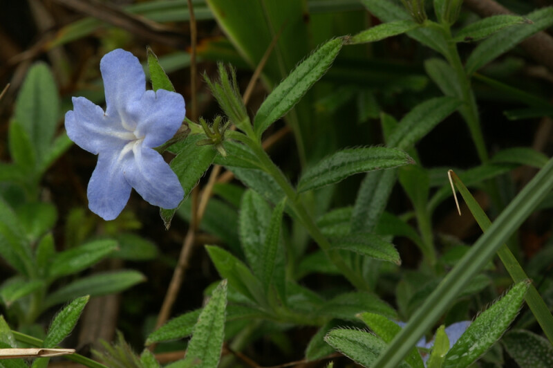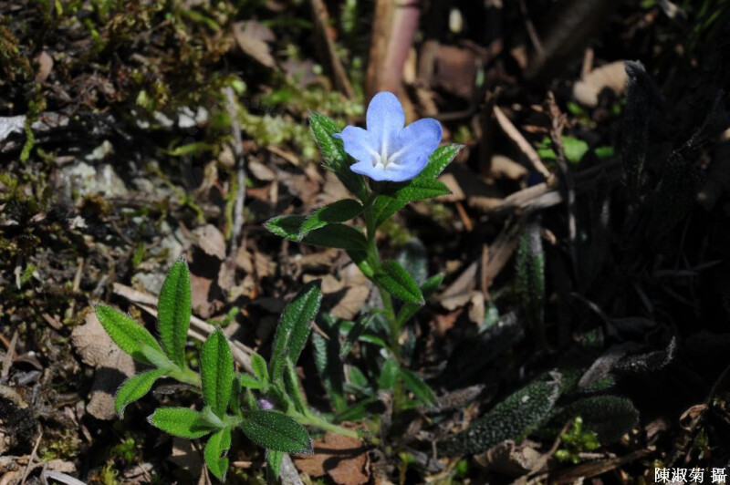 屬特徵:葉互生,全緣。花單一或聚繖花序;花瓣5,喉部具鱗片。子房四深裂,花柱基生。四小堅果。 種特徵:多年生草本,具根莖,全株被小剛伏毛。葉匙形至倒披針形,長2-6 cm,基部漸狹至近無柄。花瓣藍色至藍紫色。 (楊遠波、劉和義、施炳霖、呂勝由 1999)