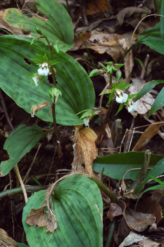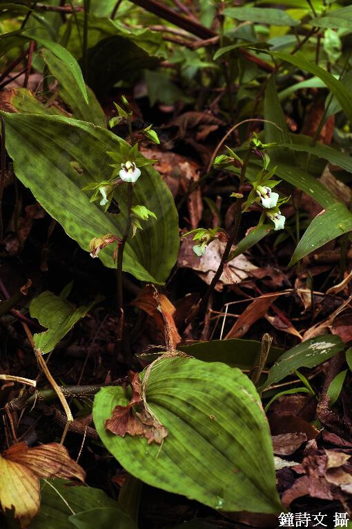 葉鬆散排於根莖上,假球莖長柱狀,長4-7 cm,寬3-5 mm。葉單生,橢圓形,長10-18 cm,寬5-8 cm。花莖具3-6朵花,花不甚張;花被片綠色;唇瓣黃色具紅斑。 (林讚標 2001)