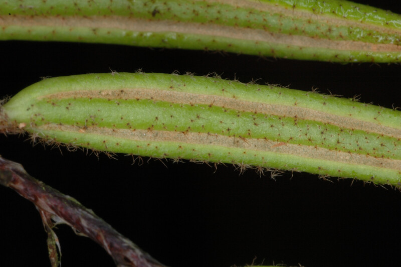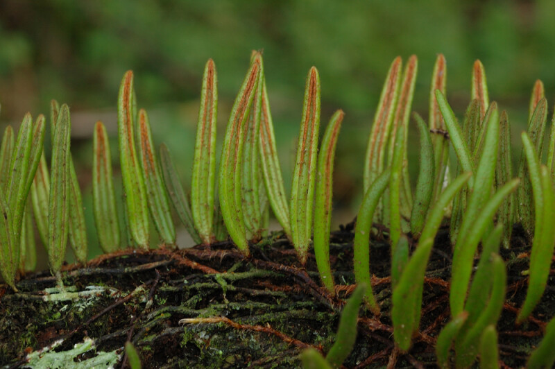 長走莖,葉小線形,2.5-11cm長,2-3.5cm寬,無柄或具短柄,葉緣反捲至中肋,孢子囊群捲於內側,呈連續的長條形。 (郭城孟 1997)