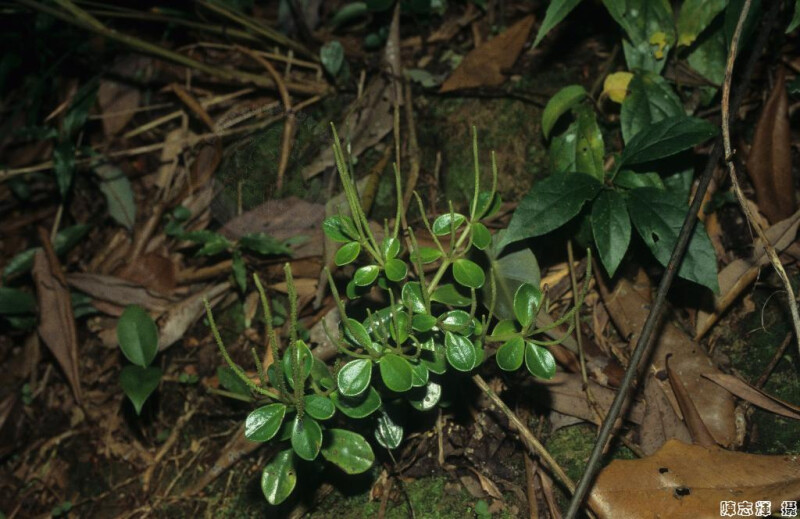 莖叢生,密生毛。葉 3-6 片輪生,橢圓至長橢圓形,長1-7 cm,寬 0.8-4.5 cm,先端鈍至圓,基部鈍至尖銳,兩面密生毛,上表面綠,下表面灰,3或5出脈。 (楊遠波、劉和義、呂勝由 1997)