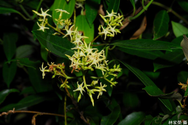 葉近革質,長橢圓狀披針形,長3-12 cm,寬1-3 cm,先端銳尖至漸尖,基部漸尖至銳尖,側脈4-7對;葉柄長5-15 mm。花灰黃色;花冠筒長3-5 mm。 (楊遠波、劉和義、施炳霖、呂勝由 1999)