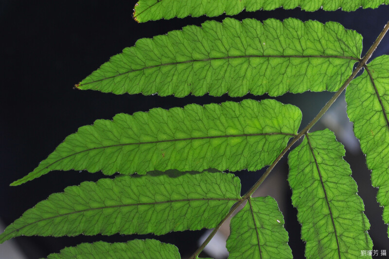 根莖短匍匐狀,徑10-15mm,鱗片披針形。柄基密佈鱗片,柄的上段,尤其是溝中具有許多小鱗片。一回羽狀複葉,頂羽片末端延長,具有帶根的不定芽。葉緣圓齒狀,缺刻中有刺齒,羽片無柄,網眼中多少有游離小脈。孢子囊全面著生。 (郭城孟 1997)