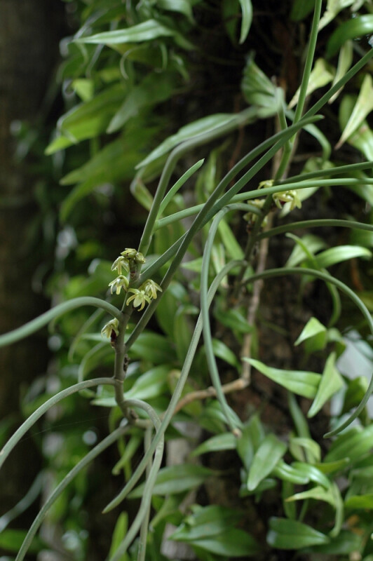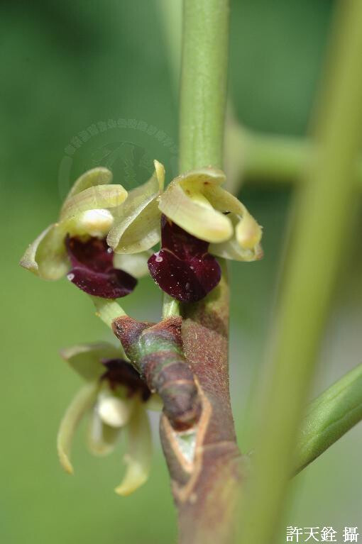 花瓣線形,寬約2 mm;唇瓣上表面暗紫紅色,3裂,兩側裂片小,中裂片心形;蕊柱腹面帶紫紅色。 (林讚標 2001)