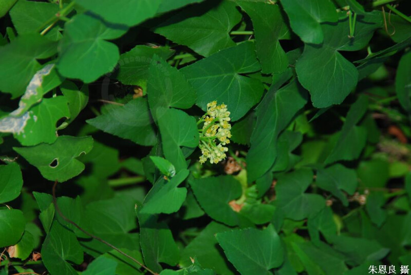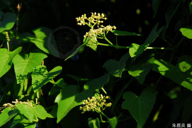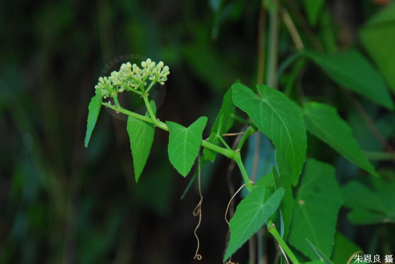 大型藤本,光滑,粉白色 (除花序外)。葉闊卵形,先端漸尖,基部闊心形,明顯銳齒緣。 (劉和義、楊遠波、呂勝由、施炳霖 1998)