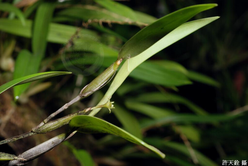 植物體叢生,分枝,懸垂。假球莖著生於每一分枝之基部,僅含一節間;假球莖略扁。葉單生,橢圓狀披針形,革質,光滑,銳頭。花白色,每次一朵,花長9 mm,半開,不足一天即凋;唇瓣不裂。蒴果橢圓體形。 (林讚標 2001)