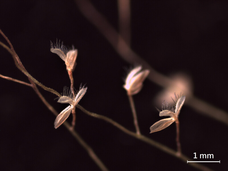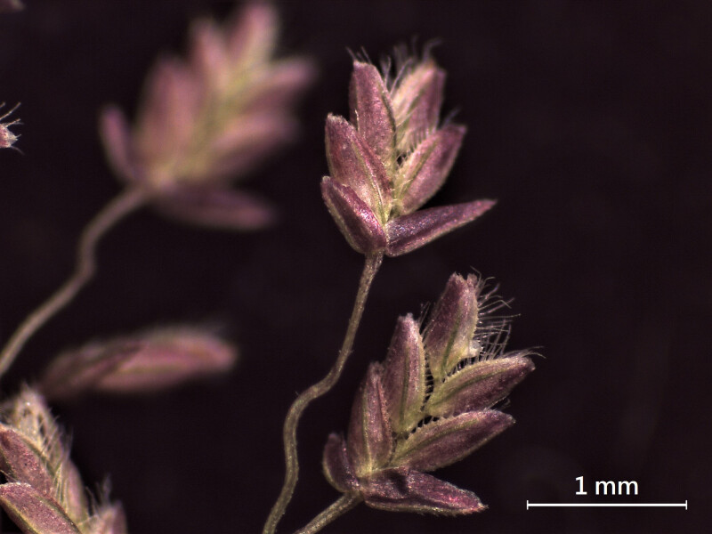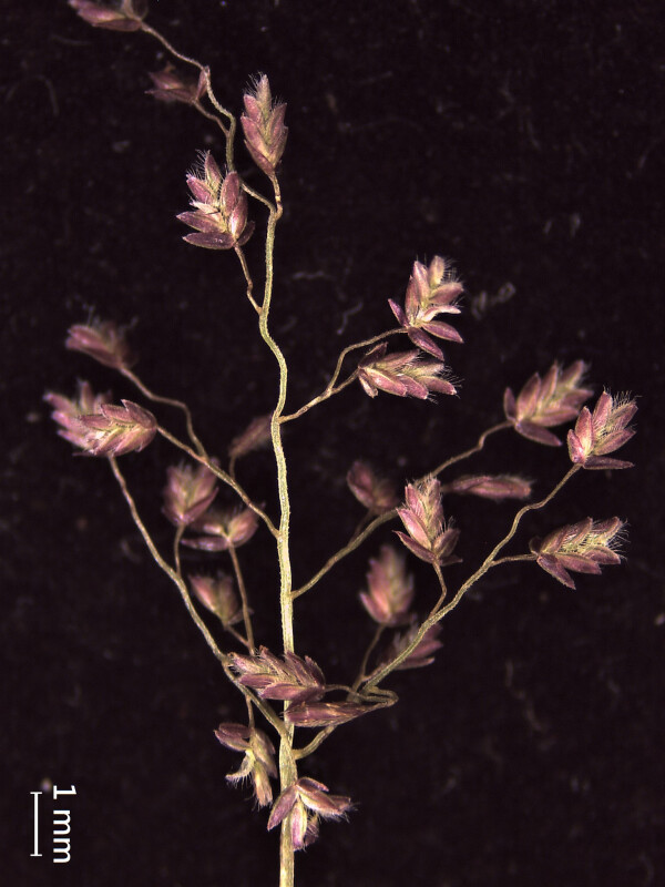 稈細軟,基部常屈膝,具節3-4個。花序展開,長5-10 cm;花序軸具腺體。小穗長約2 mm,具小花4-8朵;內稃外表面之脊上被長直毛,成熟時毛直且展開。果平滑,橫切面圓形。 (楊遠波、劉和義、郭長生、陳志輝 2001)