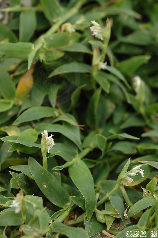 屬特徵- 多年生;稈匍匐,走莖狀,節常生根。葉片披針形;葉舌為一圈毛。雌雄同株;總狀花序早落性,穗軸葉狀;兩性小穗(或雌小穗)宿存,1至2枚於穗軸基部;雄小穗多數,早落,位於穗軸上部,開花後,雄性部位的穗軸摺合,包住孕性小穗;孕性小穗之外穎及下位外稃背向穗軸;外穎缺如或甚小;內穎、下位外稃和小穗約等長。 種特徵- 葉片長2-5 cm,寬3-6 mm;外穎透明。 (楊遠波、劉和義、郭長生、陳志輝 2001)