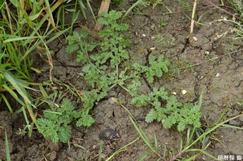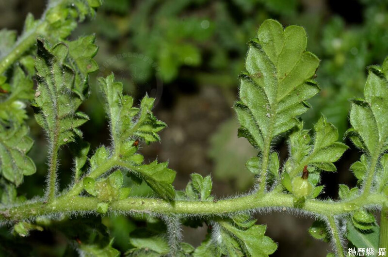 屬特徵:一年生匍匐性草本。花單生,近無柄;花瓣5,無鱗片;子房4淺裂,花柱頂生。核果,熟時先裂成二瓣,最後裂成四分核。 種特徵:葉長橢圓形至長橢圓倒卵形,長5-20 mm;側脈3-5對,於上表面處深陷;葉緣鈍鋸齒至淺裂,凹陷處與側脈相接;兩面被絹狀毛。花白色。 (楊遠波、劉和義、施炳霖、呂勝由 1999)