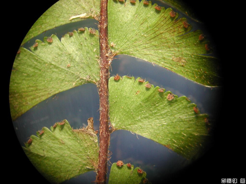 葉一回羽狀複葉,葉軸及葉密被毛,囊群蓋無毛,葉軸之遠軸面密被毛。基羽片呈半圓形或寬扇形。 (郭城孟 1997)