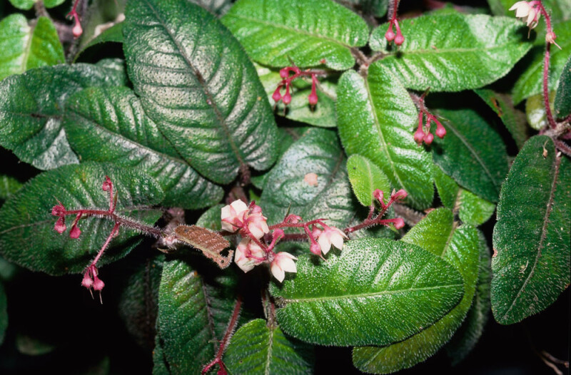 匍匐性亞灌木,高約15 cm;幼莖密被銹色多細胞長毛及短腺毛。葉互生或近輪生,紙質,卵形或橢圓形,基部明顯心形,不規則齒緣,兩面被鏽色多細胞長毛。花序近繖形,腋生於葉腋或小苞片腋。萼片狹披針形,外面被多細胞長毛。 (楊遠波、劉和義、施炳霖、呂勝由 1999)