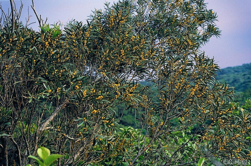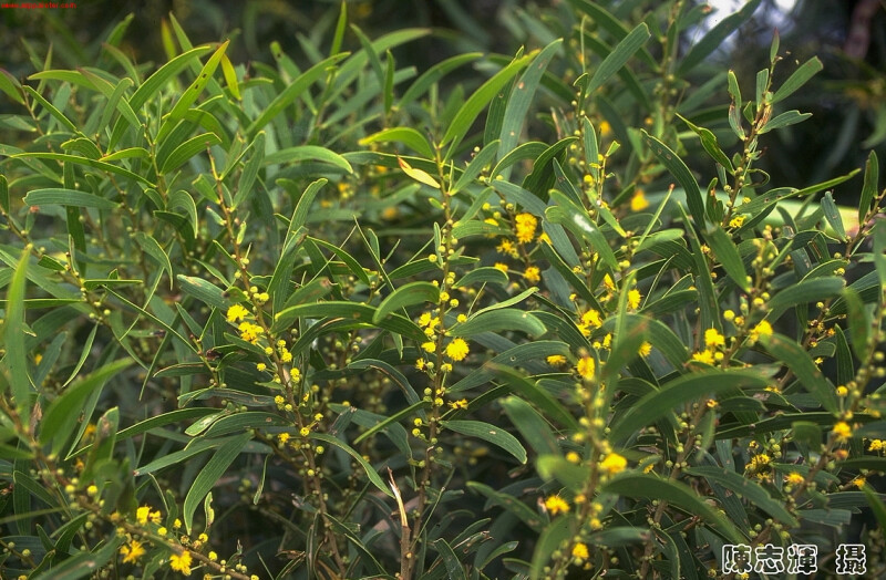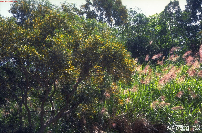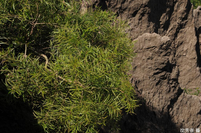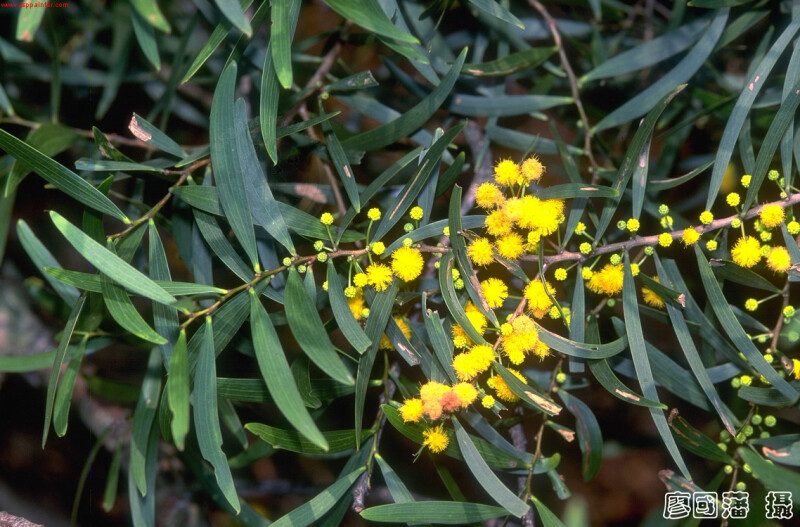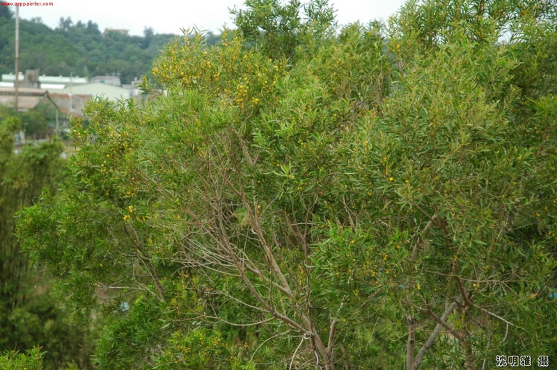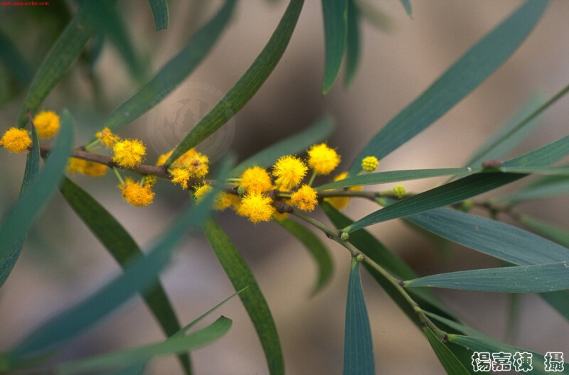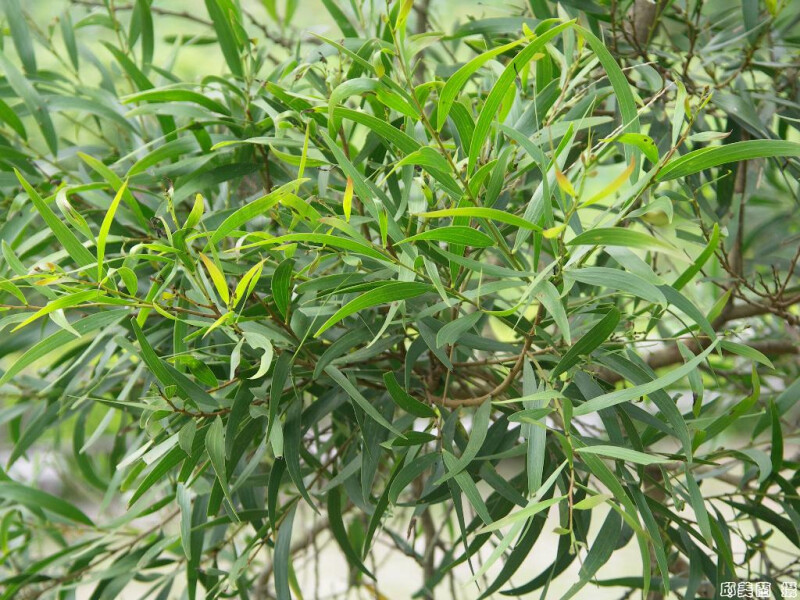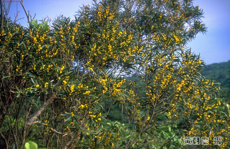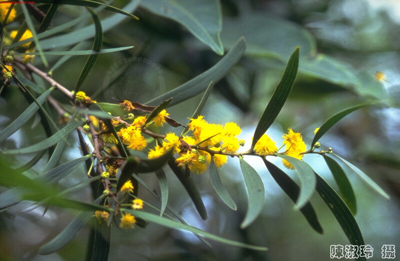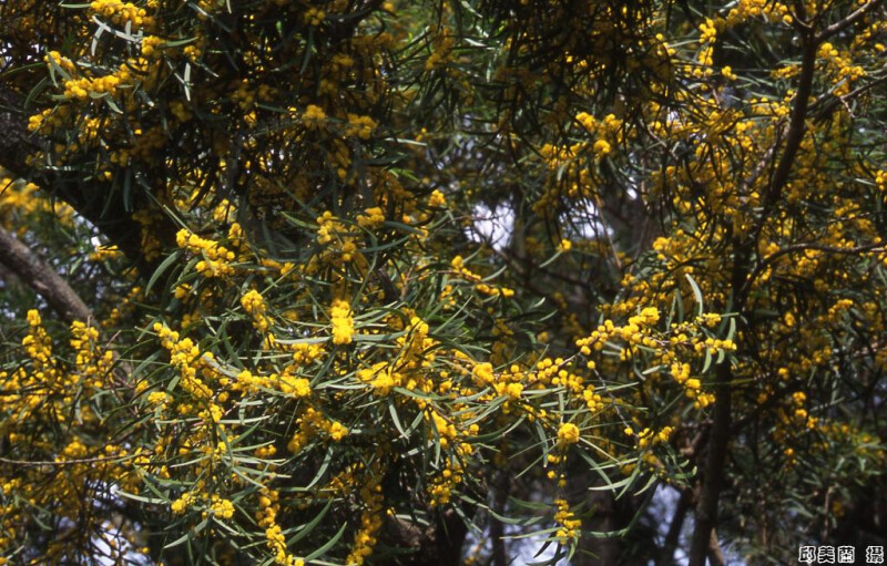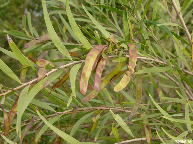 枝條平滑無刺。假葉無柄,鐮刀狀披針形。莢果有節,種子7-8粒。 (劉和義、楊遠波、呂勝由、施炳霖 1998)