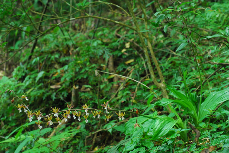 植物體與阿里山根節蘭(C. arisanensis)略相似,葉柄稍粗。總狀花序,約著生9朵花,鬆散排列。花面朝下,花徑約3 cm。萼片及花瓣多少向後伸張,表面淡黃褐色,外側紅褐色至土褐色。唇瓣平展,近乎白色,倒卵形。 (林讚標 2001)