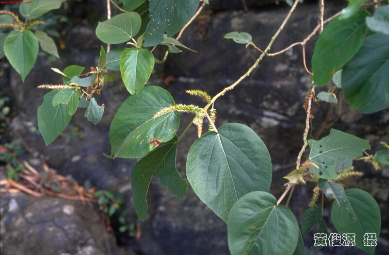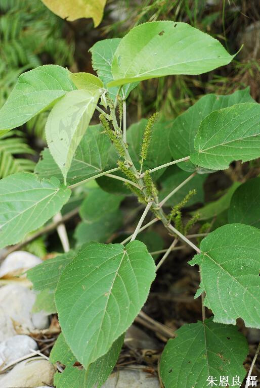單性同株,灌木或小喬木;莖被絨毛。葉心形、卵形、披針形至菱形,長12.3-19.1 cm,寬6.9-11.7 cm,先端漸尖至尾狀,基部心至圓形,基出5-7脈,兩面密被毛;葉柄較葉片短;托葉披針形,長1-1.7 cm,先端尾狀或漸尖。 (劉和義、楊遠波、呂勝由、施炳霖 1998)