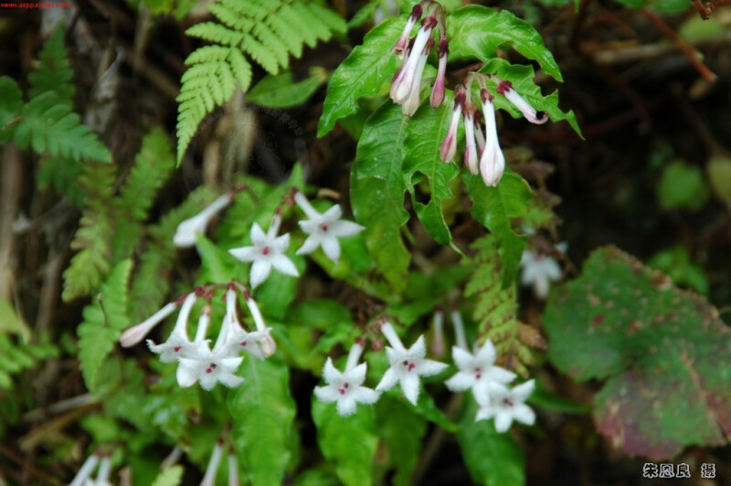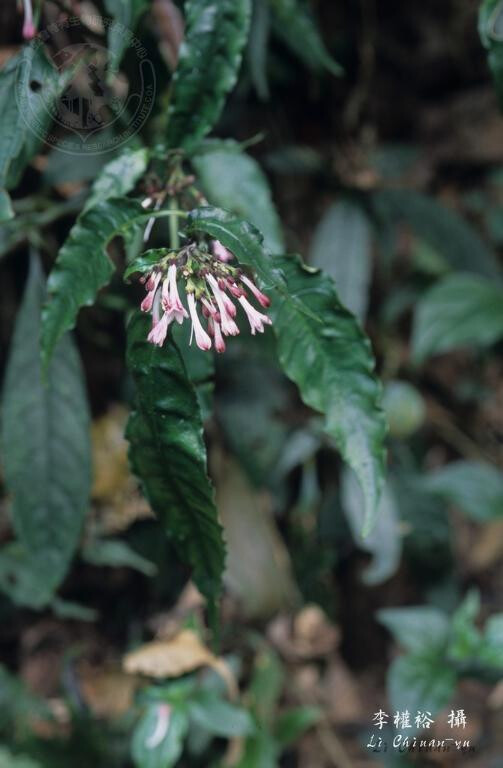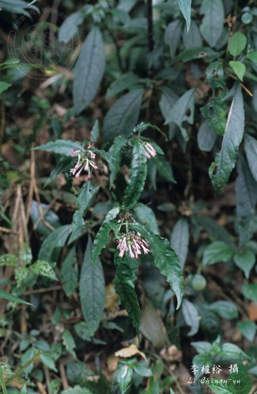 葉長橢圓披針形至長橢圓倒披針形,長8-16 cm,先端尾狀漸尖,基部漸狹,無毛;葉柄長1-2 cm。花冠喉部被毛。 (楊遠波、劉和義、施炳霖、呂勝由 1999)