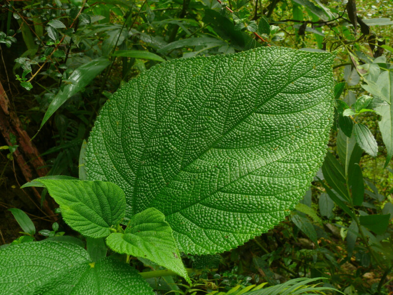 高大灌木。莖直立,小枝密生貼伏毛,漸變無毛。葉寬卵形、歪卵形或近於圓形,長10-27 cm,寬6.5-20 cm,先端銳尖至漸尖,細鋸齒緣,葉基鈍至圓。產於蘭嶼及東海岸秀姑巒溪出海口附近山溝中。 (施炳霖 1997)