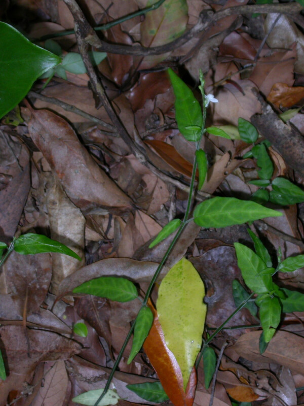莖被短柔毛。葉膜質,卵或闊卵形,長0.7-2.2 cm,先端鈍,基部寬楔形,上表面綠色並具白色網紋。花無柄。 (楊遠波、劉和義、施炳霖、呂勝由 1999)