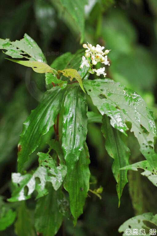 葉披針狀橢圓形,長13-27 cm,寬2.8-5.6 cm,上表面密被細粗毛,下表面被鉤毛及伏毛。 (王震哲、彭鏡毅 2001)