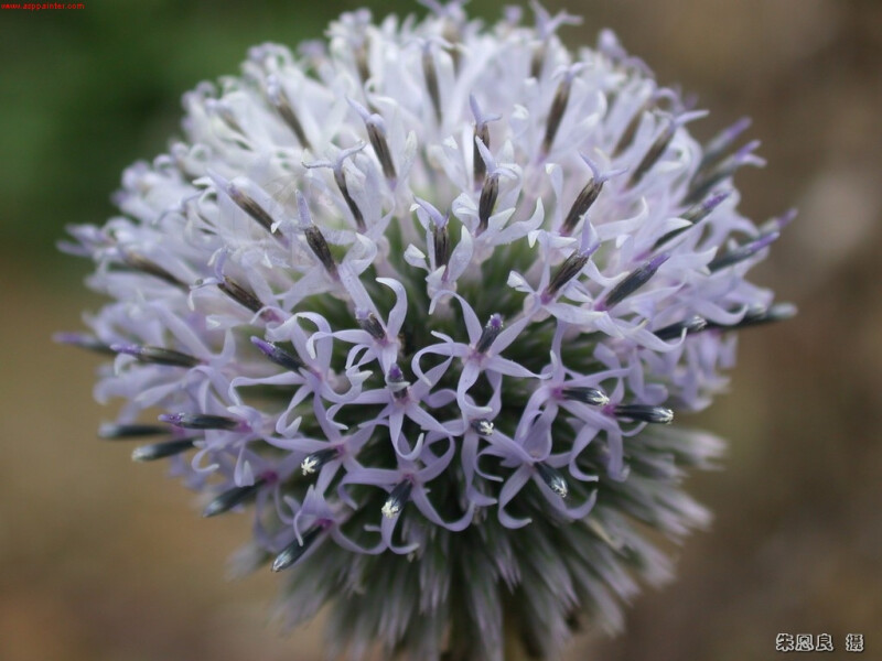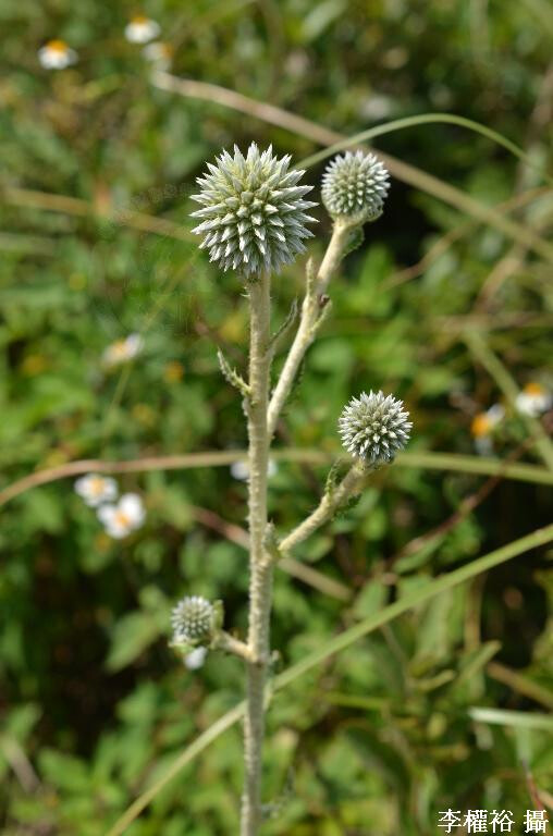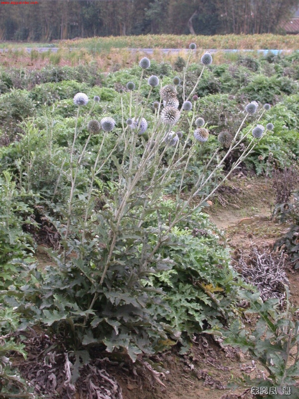 屬特徵:高大粗壯的多年生草,本莖被白絨毛。葉互生,羽狀淺裂或全裂,葉緣有刺。頭花僅具1朵小花,無總梗,多數頭花聚生為圓球狀的複頭狀花序。小花全為管狀,白或藍色。瘦果密被毛。多數鱗片或剛毛形成一冠狀冠毛。 種特徵:莖高30-80 cm。葉類似薊屬植物的葉,羽狀全裂,裂片約4對,葉緣有刺,下表面密被白色絨毛。頭花叢頂生,直徑約4 cm,花冠淡藍色。瘦果圓柱狀,被長毛。 (楊遠波、劉和義、施炳霖、呂勝由 1999)