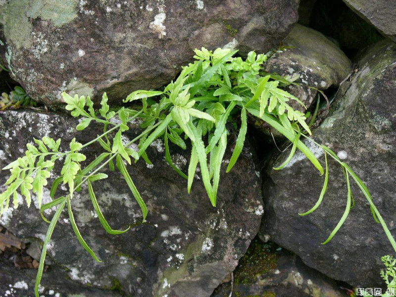 頂羽片單一,側羽片多少分叉,形成不規則多裂,羽軸兩側之羽片不對稱,葉軸無翅。 (郭城孟 1997)