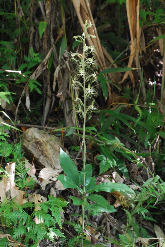 地生。塊根2個,長橢圓形。莖圓柱狀,上半部具10-12片葉,下半部具數片鞘狀葉。花40朵左右;花瓣淡綠,裂成2束絲狀構造;唇瓣成3裂片,淡綠,側裂片向上彎曲,絲狀,中裂片自中部裂為3條細絲狀。 (林讚標 2001)