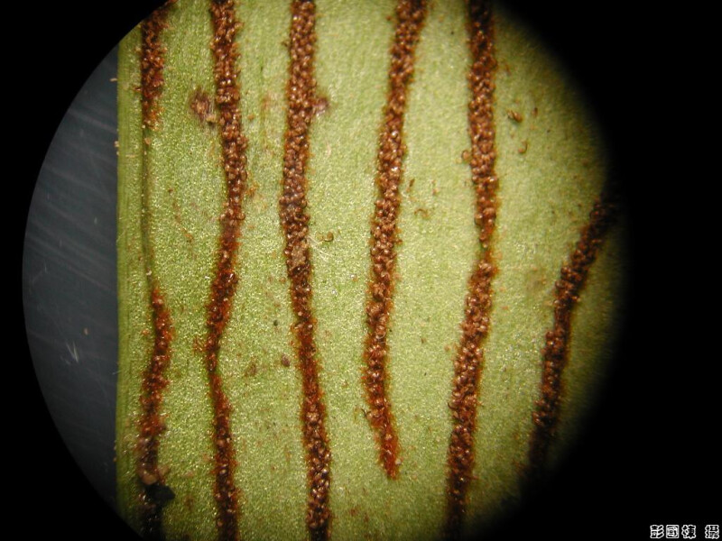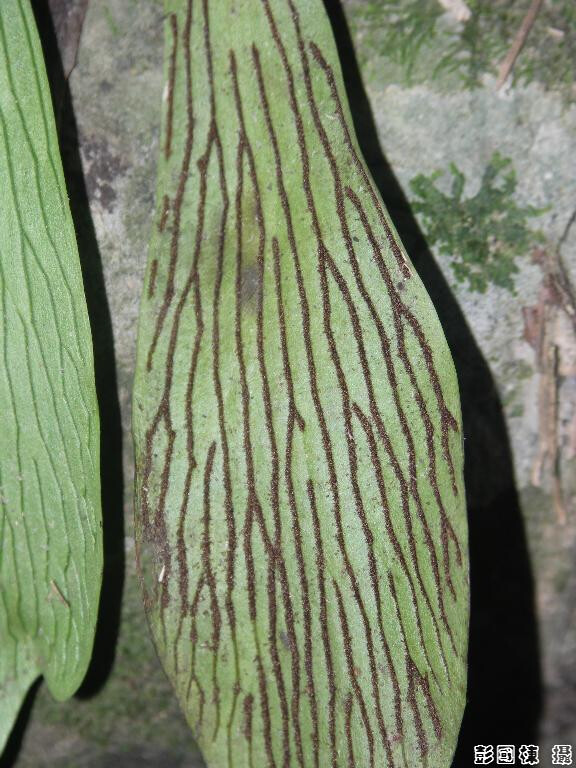 根莖短,鱗片6-7mm長,暗褐色,披針形,窗格狀。葉橢圓形至梭形,最寬處在中間偏末端。孢子囊沿脈生長。 (郭城孟 1997)