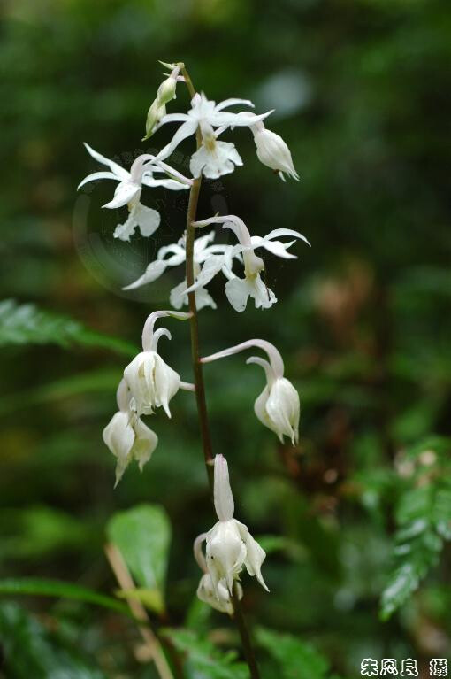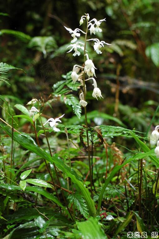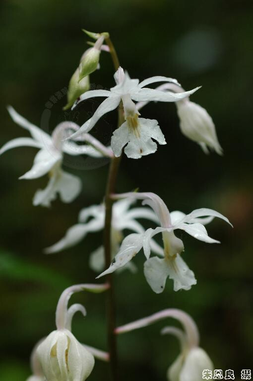 假球莖叢生狀。葉2-3片,橢圓狀倒披針形,長30-50 cm,寬4-7 cm,銳頭,上表面具光澤。總狀花序,約6-7朵花,鬆散排列。萼片略相似,白色,背面常帶紫暈。花瓣線狀常橢圓,白色;唇瓣寬卵形,先端短尾狀,白色。 (林讚標 2001)