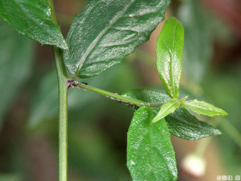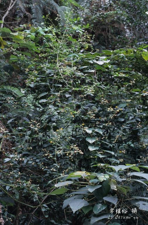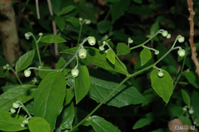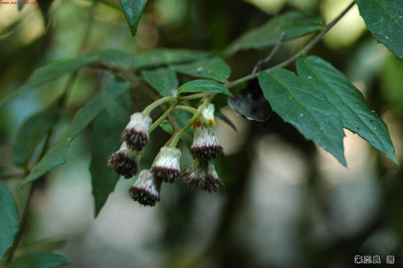 多年生小灌木或攀緣性灌木,長4-6 m。莖葉厚,長橢圓形,9-11 ?e 2.5-4 cm,葉具疏突齒或突鋸齒緣,無毛或兩面被疏毛。頭花半球形,10-15 ?e 12-13 mm,頂生或腋生,圓錐狀排列。總苞先端帶紫色。心花黃色。 (楊遠波、劉和義、施炳霖、呂勝由 1999)