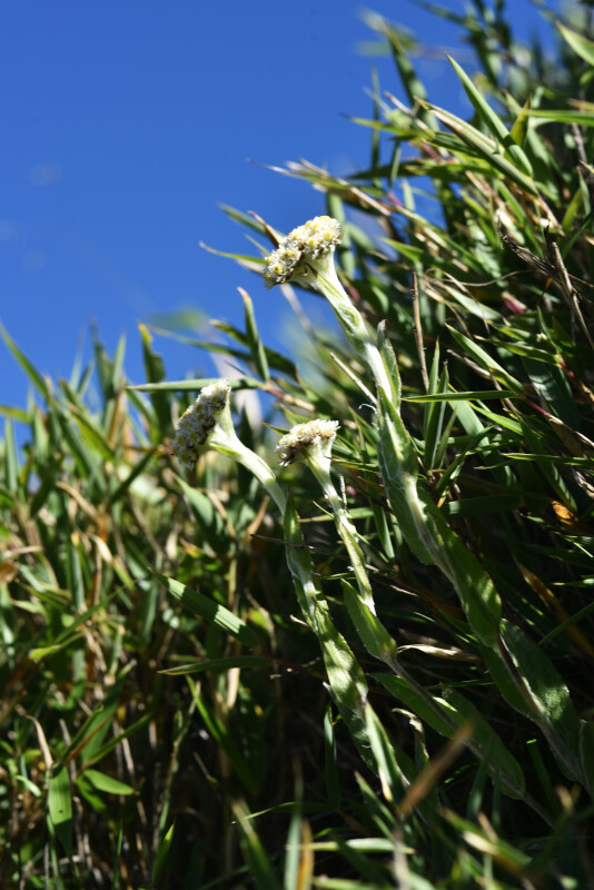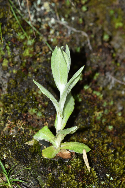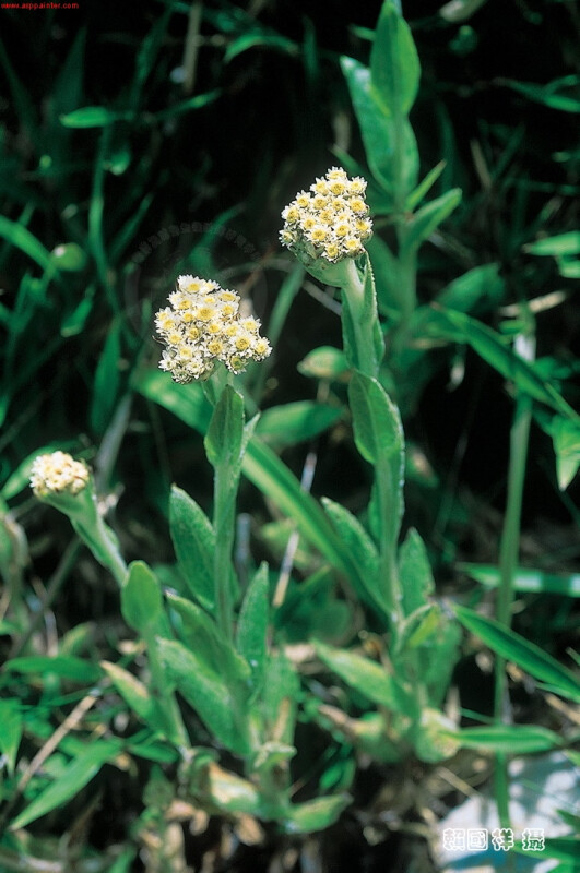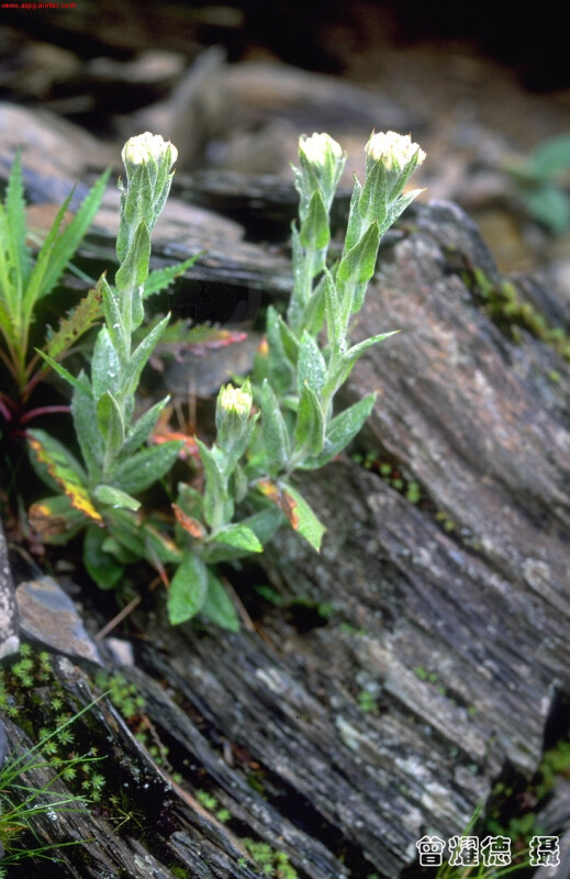 莖直立不分枝,植株高10-25 cm,密被灰色絨毛。葉薄,橢圓形至寬橢形,3-8 ?e 1-2.5 cm。頭花多數密生,繖房狀排列。總苞半球形,總苞片5層。 (楊遠波、劉和義、施炳霖、呂勝由 1999)