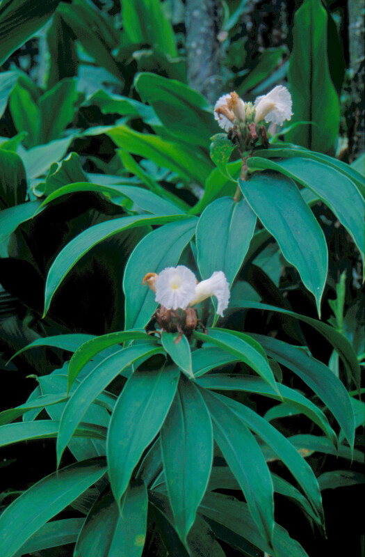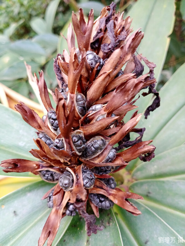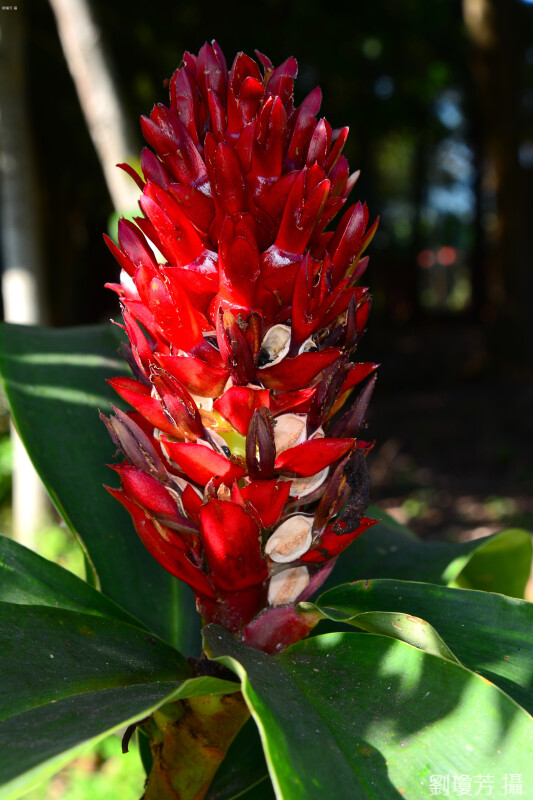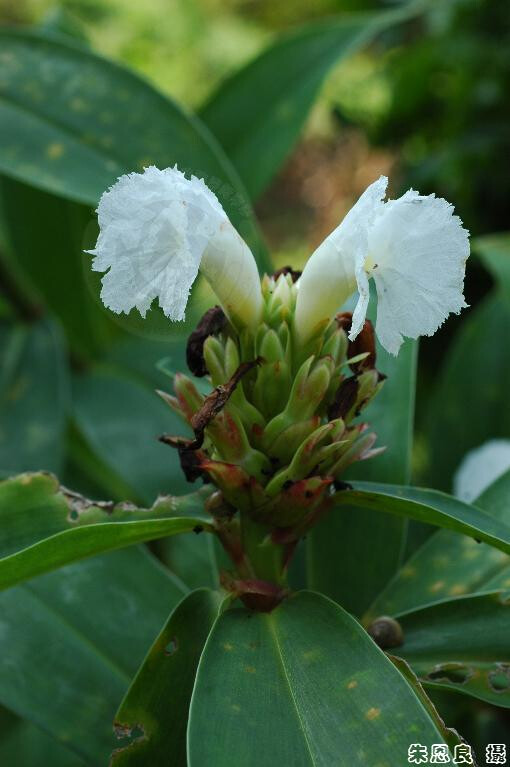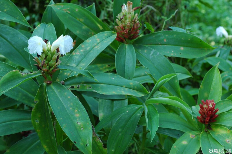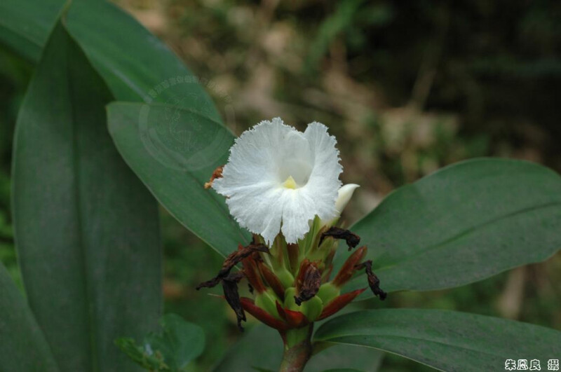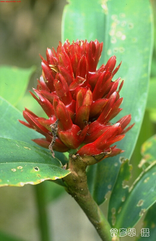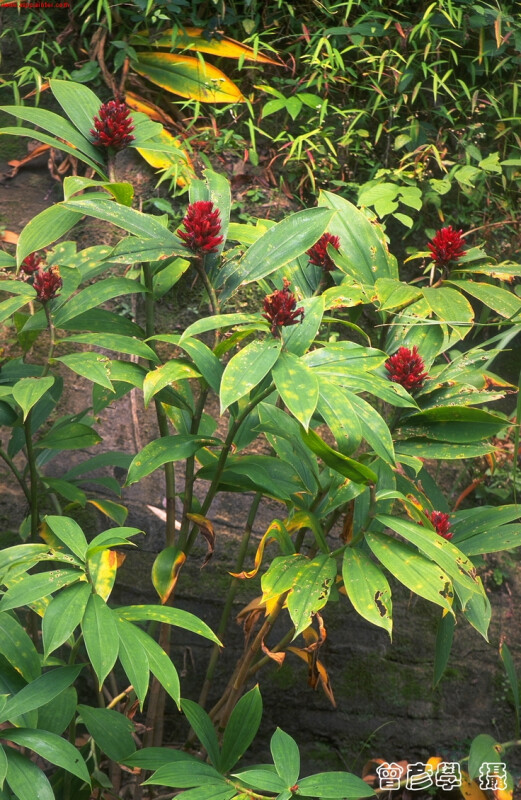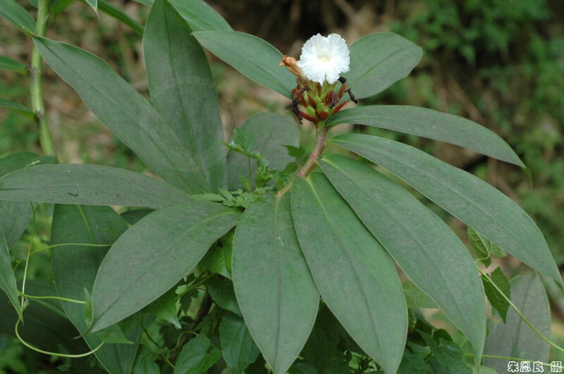 屬特徵- 莖螺旋狀彎曲。葉螺旋狀排列,具不裂葉鞘。花序穗狀,頂生;苞片覆瓦狀排列,各有1-2小苞片。花萼3裂;花冠下方具長花管,裂片約等大;唇瓣倒卵形;雄蕊具花瓣狀花絲,花藥於花絲前端。蒴果。 種特徵- 葉生於莖下部者僅具葉鞘,卵形,先端漸尖,基部近圓形。 (楊遠波、劉和義、林讚標 2001)